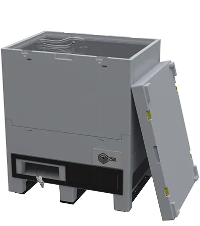 Compatible with all 3D gamma-irradiated single-use bags, this 250L tote provides ample capacity while retaining a compact footprint. Lockable access points and a dedicated tube compartment prevent tampering and ensure safe transfer of critical fluids. Its collapsible frame supports efficient handling and storage throughout your GMP logistics chain.